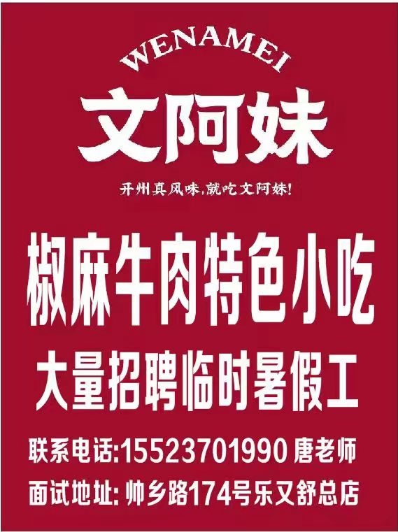 招暑假工哟!为了帮助刚毕业的高中生提升社交能力,演说和行为能力,开州知名品牌文阿妹椒麻牛肉面向社会招一百名临时暑假工,!提升能力同时顺便赚到钱。具体面谈。